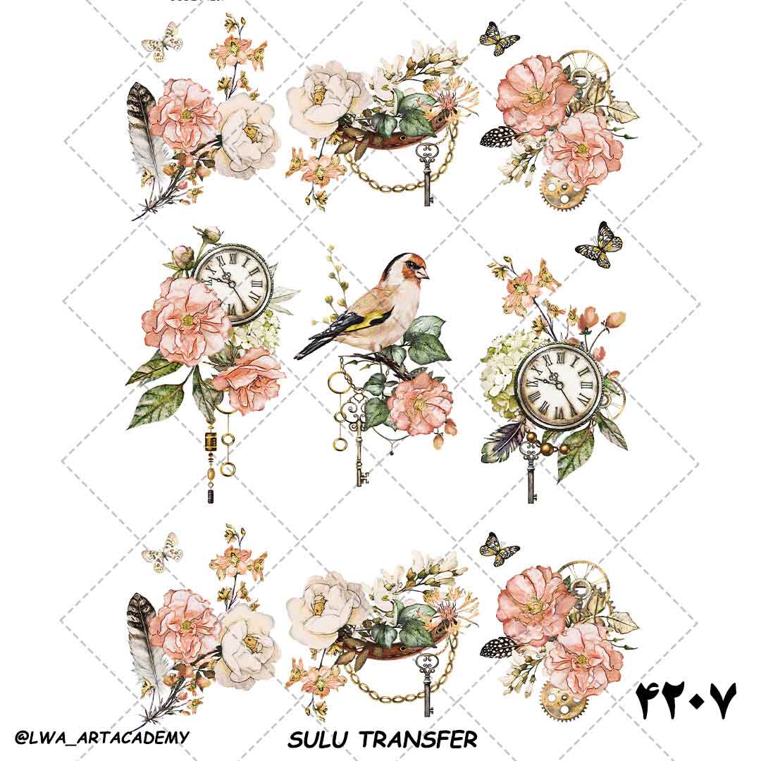 توضیحات این ترنسفرها به علت تنوع بالا و استفاده آسان و طرح های به روز امروزه بسیار پرطرفدار هستند.با استفاده از این طرح ها میتوایند تغییرات جزئی و یا تغییرات بزرگی رو انواع وسایل و روی انواع سطوح شیشه ، سرامیک ، چوب ، شمع ، پلی استر و… ایجاد کنید.کیفیت بالا و جزییات به کار رفته در تمامی طرح ها باعث میشود نتیجه کار شما فوق العاده حرفه ای و بی نقص باشد.به علت تنوع بالا و قیمت مناسب این ورق ها حتی اگر مهارت بالایی در نقاشی و ایجاد طرح های ظریف رو نداشته باشید ، میتوانید طرح مورد نظرتون رو خیلی راحت روی کار ایجاد کنید. نحوه استفاده در ابتدا دور طرح مورد نظز را برش دهید ، بعد از آن ورق را داخل آب ولرم قرار دهید و چند دقیقه صبر کنید. بعد از مدت کوتاهی طلق از برگه زیرین جدا شده و شما میتوانید به راحتی طرح را بر روی هر سطحی بچسبانید ، روش دیگر چسباندن این طرح این است که بعد از حدود دو دقیقه ، کاغذ را بردارید و از قسمت طلقی روی سطح قرار بدید ، بعد از چسبیدن طلق ، کاغذ پشت را از طرح جدا کنید. بعد از قرار گرفتن طرح بر روی سطوح با دستمال خشک (از دستمال مرطوب استفاده نکنید)روی طرح کشیده که هوا و حباب های داخل آن گرفته شود. این ورق ها به چسب احتیاج ندارند ولی برای اطمینان بیشتر میتوانید از وارنیش پایه آب استفاده نموده و تثبیت کنید. برای اینکه طرحتون واضح تر دیده شود و زیبایی خود را کاملا نمایش دهد بهتر است روی سطوح سفید و یا روشن از این ورق ها استفاده شود که برای اینکار میتونید سطح کار را با رنگ سفید اکرلیک رنگ نمایید.